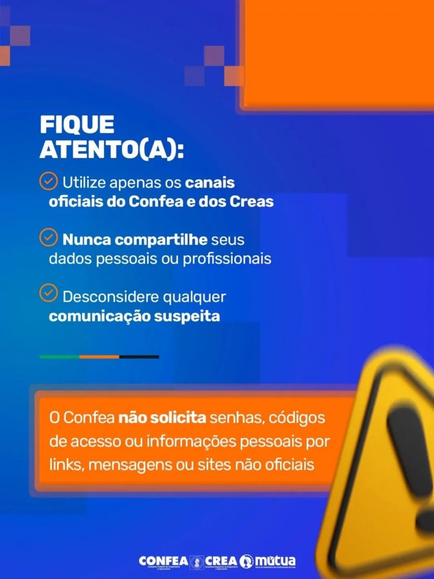 Caso receba qualquer solicitação suspeita, não clique em links desconhecidos, não compartilhe suas informações e procure diretamente o seu Crea ou os canais oficiais do Confea.