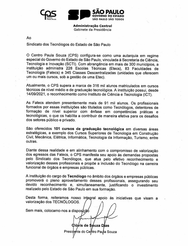 O Centro Paula Souza (CPS), responsável pela formação de Tecnólogos por meio das FATECs, manifestou apoio institucional às demandas apresentadas pelo Sindicato, conforme ofício recebido. O apoio do CPS reforça a importância da inclusão dos Tecnólogos nos espaços de atuação profissional e reforça o trabalho que vem sendo desenvolvido pelo Sindicato.