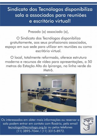 | Sindicato dos Tecnólogos disponibiliza sala a associados para reuniões e escritório virtual