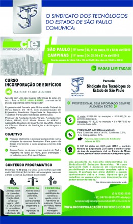 O Sindicato dos tecnólogos do Estado de São Paulo e o CIE promoverão, entre os meses de março e abril, em São Paulo/SP e Campinas/SP, curso sobre Incorporação de Edifícios. Com o objetivo de levar informação de qualidade aos tecnólogos que atuam ou tenham interesse em atuar na incorporação imobiliária. Associados do Sindicato têm 20% de desconto. Vagas limitadas.