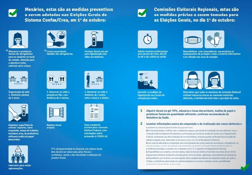Na segunda-feira. 21 de setembro, foi publicada a Deliberação 180/2020, que complementa os protocolos sanitários já estabelecidos em resoluções anteriores. Entre as medidas, está a determinação de quando da abertura do processo de votação, no dia 1º de outubro de 2020, o presidente da mesa apresentará aos presentes que a urna está vazia, e na sequência, lacrará a urna, e, posteriormente a higienizará com álcool 70%. O texto estabelece ainda que os mesários deverão promover a higienização com álcool 70% de todo material utilizado pelo eleitor, como por exemplo, canetas e cabine de votação, ao término de cada voto. Cabe destacar que quando ocorrer no local de votação, a apuração dos votos terá início imediatamente após o encerramento da eleição e não será interrompida até sua conclusão, observadas as medidas preventivas. Entretanto, quando a apuração dos votos ocorrer na sede do Regional, ao ser recebido na sede do Crea, o material das eleições deverá ser higienizado antes de ser apurado e os membros e assessores da CER, durante todo o período em que durar a apuração dos votos, deverão observar o distanciamento mínimo de um metro entre eles, e as recomendações preventivas ao contágio do novo coronavírus.