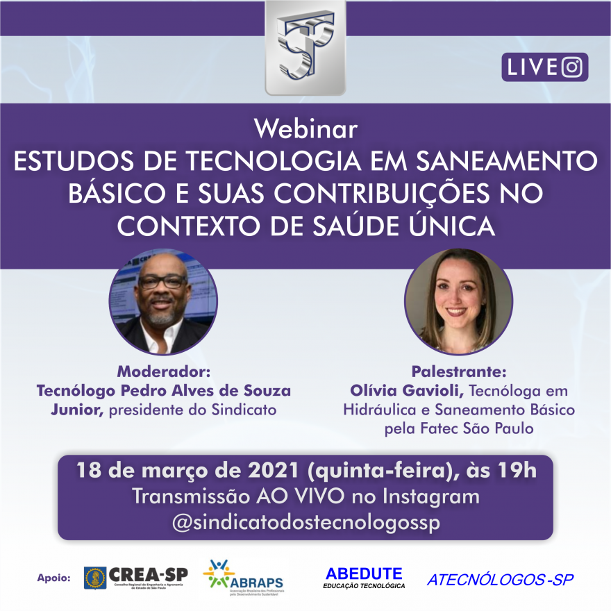 “Estudos de tecnologia em saneamento básico e suas contribuições no contexto de saúde única” é o tema central do webinar que será realizada pelo Sindicato dos Tecnólogos do Estado de São Paulo no dia 18 de março, às 19h, por meio do seu perfil do Instagram (acesse aqui).
